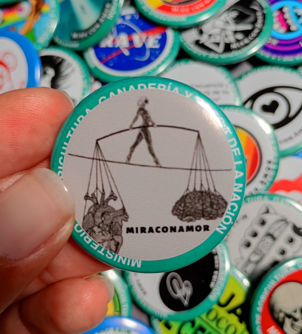 Conscientes y divertidos pines metálicos de 38mm, elaborados a partir de pines reciclados con arte original Mira con Amor, diseñados para crear consciencia sobre la importancia del amor propio!