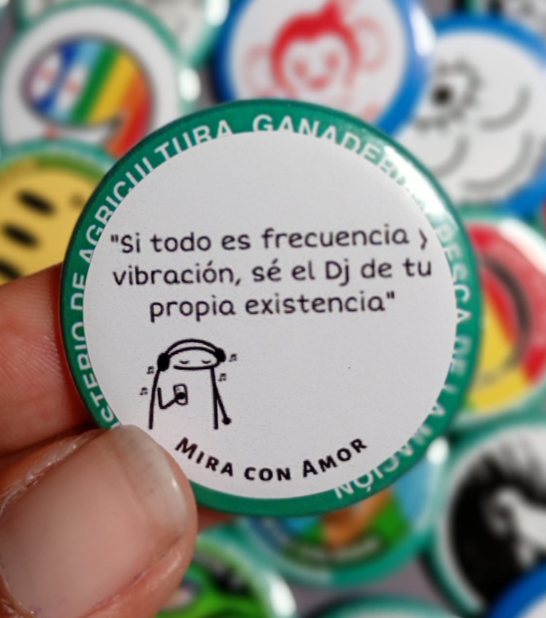 Conscientes y divertidos pines metálicos de 38mm, elaborados a partir de pines reciclados con arte original Mira con Amor, diseñados para crear consciencia sobre la importancia del amor propio!