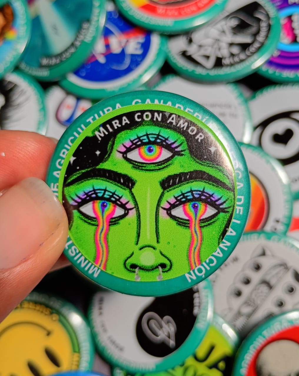 Conscientes y divertidos pines metálicos de 38mm, elaborados a partir de pines reciclados con arte original Mira con Amor, diseñados para crear consciencia sobre la importancia del amor propio!
