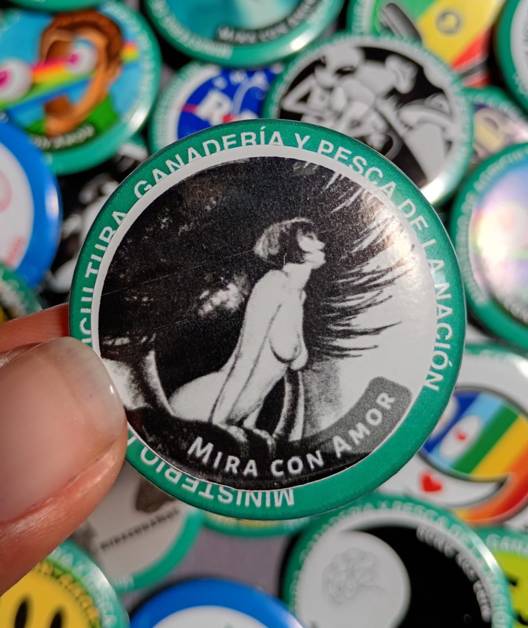 Conscientes y divertidos pines metálicos de 38mm, elaborados a partir de pines reciclados con arte original Mira con Amor, diseñados para crear consciencia sobre la importancia del amor propio!