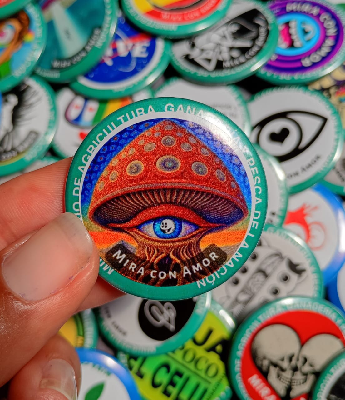 Conscientes y divertidos pines metálicos de 38mm, elaborados a partir de pines reciclados con arte original Mira con Amor, diseñados para crear consciencia sobre la importancia del amor propio!